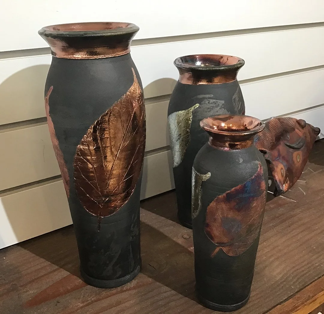 “I make my Raku Pottery on the potters wheel, the rest I hand build with white stoneware clay.” The raku firing along with post fire reduction gives the glazes iridescent metallic effects and gives the white clay amazing crackle patterns. It also blackens the clay where there is no glaze. This unique process of firing gives each piece its individual characteristics so no two pieces are alike making each piece of Raku Pottery a unique piece of art.